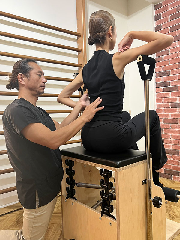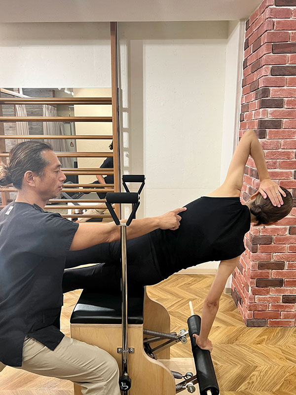 セルフエクササイズを目的とするシュロス法に対して、側弯症ピラティスはピラティスマシンを駆使してエクササイズを行っていきます。