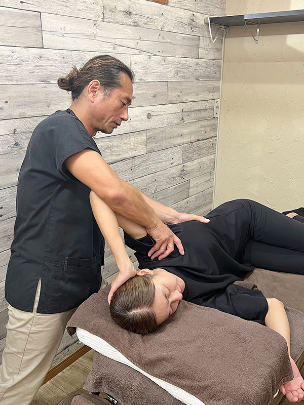 背骨の捻れに対して、呼吸法を使い矯正をしていきます。